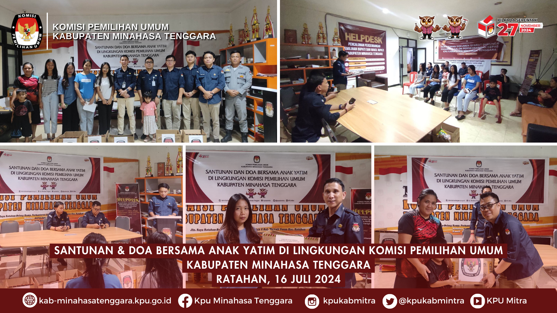Ratahan - Komisi Pemilihan Umum Kabupaten Minahasa Tenggara (KPU Mitra) menggelar santunan dan doa bersama anak yatim di lingkungan KPU. Kegiatan yang merupakan program dari Komisi Pemilihan Umum Republik Indonesia (KPU RI) ini dilaksanakan pada Selasa, 16 Juli 2024.