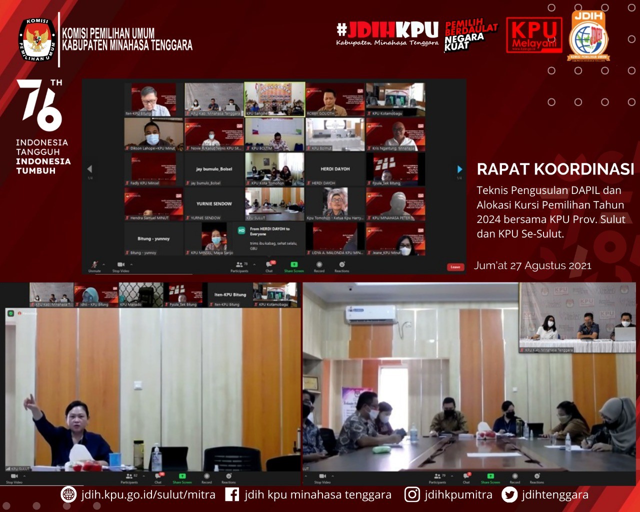 RATAHAN - Komisi Pemilihan Umum (KPU) Kabupaten Minahasa Tenggara (Mitra) mengikuti kegiatan Rapat Koordinasi (Rakor) Teknis terkait Pengusulan Daerah Pemilihan (Dapil) dan Alokasi Kursi pada Pemilihan Umum tahun 2024 secara virtual melalui aplikasi Zoom Meeting, Jumat (27/08/2021).