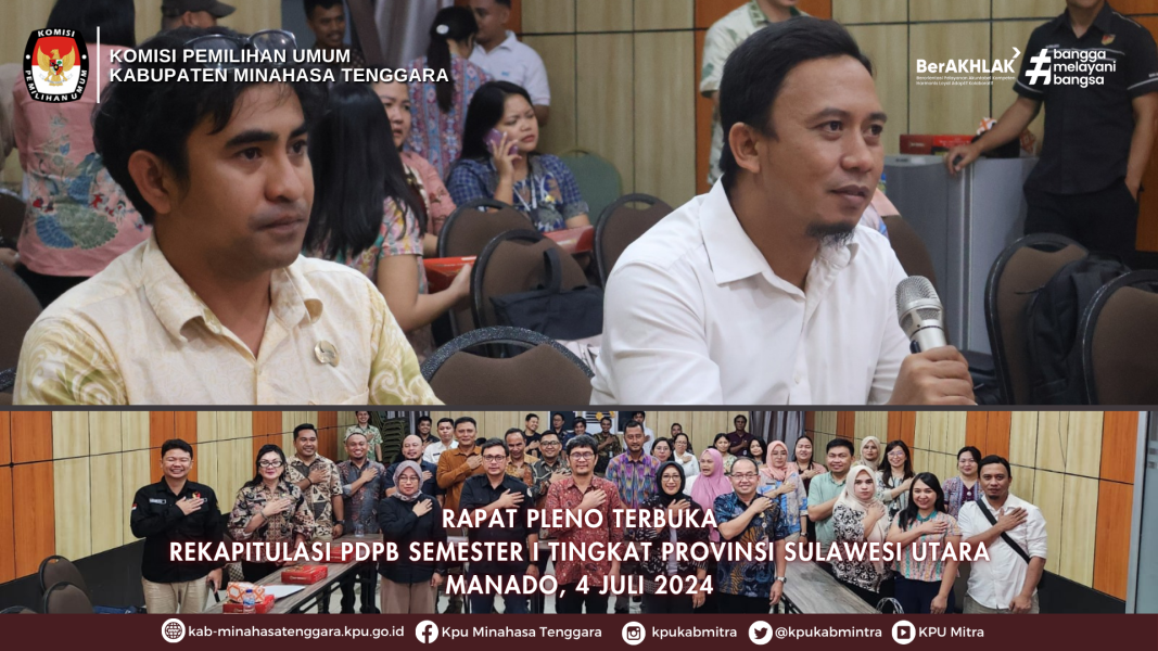 Komisi Pemilihan Umum (KPU) Kabupaten Minahasa Tenggara menghadiri Rapat Pleno Terbuka Rekapitulasi Pemutakhiran Data Pemilih Berkelanjutan (PDPB) Semester I Tahun 2025 Tingkat Provinsi yang diselenggarakan oleh KPU Provinsi Sulawesi Utara. Kegiatan ini berlangsung di Aula Kantor KPU Provinsi Sulawesi Utara, Manado, Jum'at (04/07/2025).