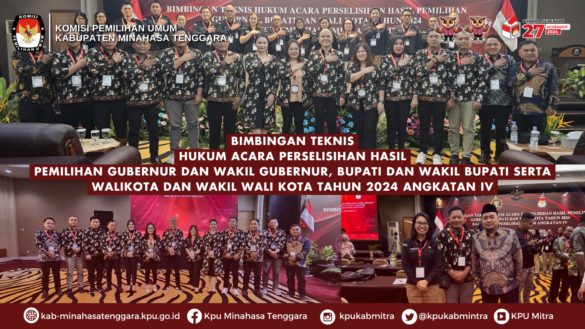 Ratahan - Ketua Divisi Hukum dan Pengawasan Komisi Pemilihan Umum Kabupaten Minahasa Tenggara Satro Mokoagow, S. Pd serta Kasubag Teknis Penyelenggaraan dan Hukum Svedlana Manuhuruapon, S. IP mengikuti Bimbingan Teknis Hukum Acara Perselisihan Hasil Pemilihan Gubernur dan Wakil Gubernur, Bupati dan Wakil Bupati serta Walikota dan Wakil Wali Kota Tahun 2024 Angkatan IV yang dilaksanakan oleh KPU RI melalui Pusat Pendidikan Pancasila dan Konstitusi Mahkamah Konstitusi RI pada tanggal 18 s/d 20 September 2024 di Royal Safari Garden Kota Bogor Jawa Barat, kegiatan tersebut dibuka secara langsung oleh Ketua KPU RI Mochammad Afifuddin serta dihadiri langsung oleh yang Mulia Hakim MK Prof Dr. Saldi Isra dan Plt kepala Pusdik Pancasila MK Nanang Subekti.