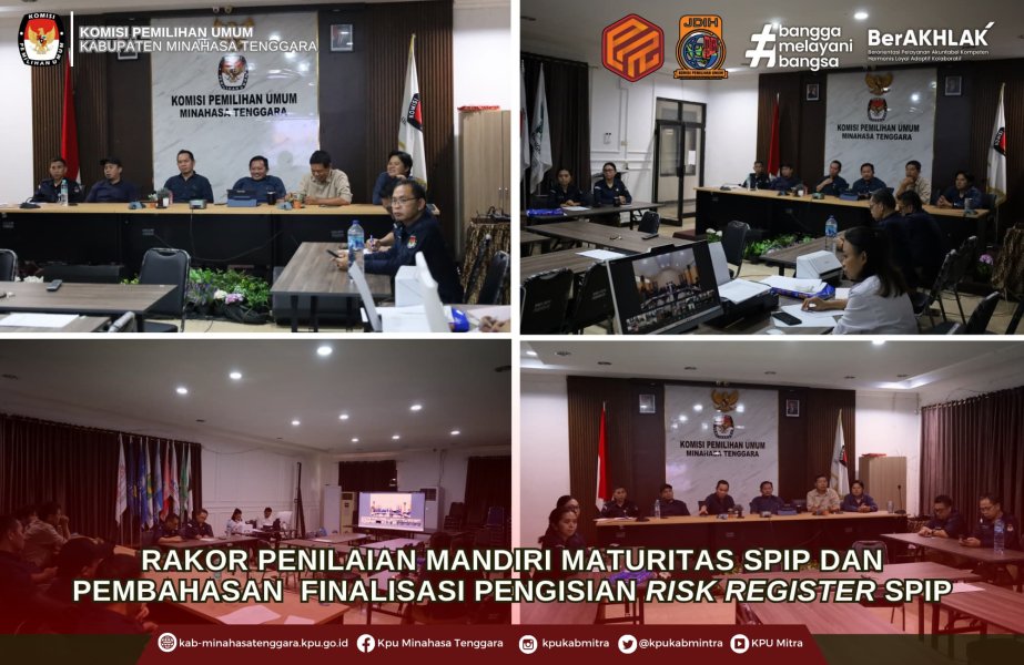 Ratahan - Komisi Pemilihan Umum (KPU) Minahasa Tenggara mengikuti Rapat Koordinasi (Rakor) bersama KPU Sulawesi Utara terkait Penilaian Mandiri Maturitas SPIP dan Pembahasan Finalisasi Pengisian Risk Register SPIP pada Selasa, 24 Juni 2025 yang dilaksanakan secara daring via Zoom Meeting. Kegiatan ini diikuti oleh Ketua dan seluruh anggota KPU Minahasa Tenggara, Sekretaris para Kasubbag KPU Minahasa Tenggara. Selain itu, kegiatan ini diikuti pula oleh seluruh satuan Kerja KPU Kabupaten/Kota se-Sulawesi Utara.