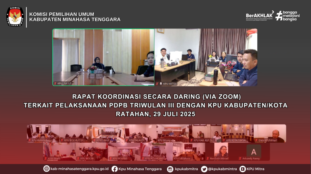 Ratahan — Komisi Pemilihan Umum (KPU) Kabupaten Minahasa Tenggara (Mitra) mengikuti Rapat Koordinasi secara daring melalui Zoom Meeting yang diselenggarakan oleh KPU Provinsi Sulawesi Utara, Selasa (29/07/2025). Rapat ini membahas pelaksanaan Pemutakhiran Data Pemilih Berkelanjutan (PDPB) untuk Triwulan III Tahun 2025.