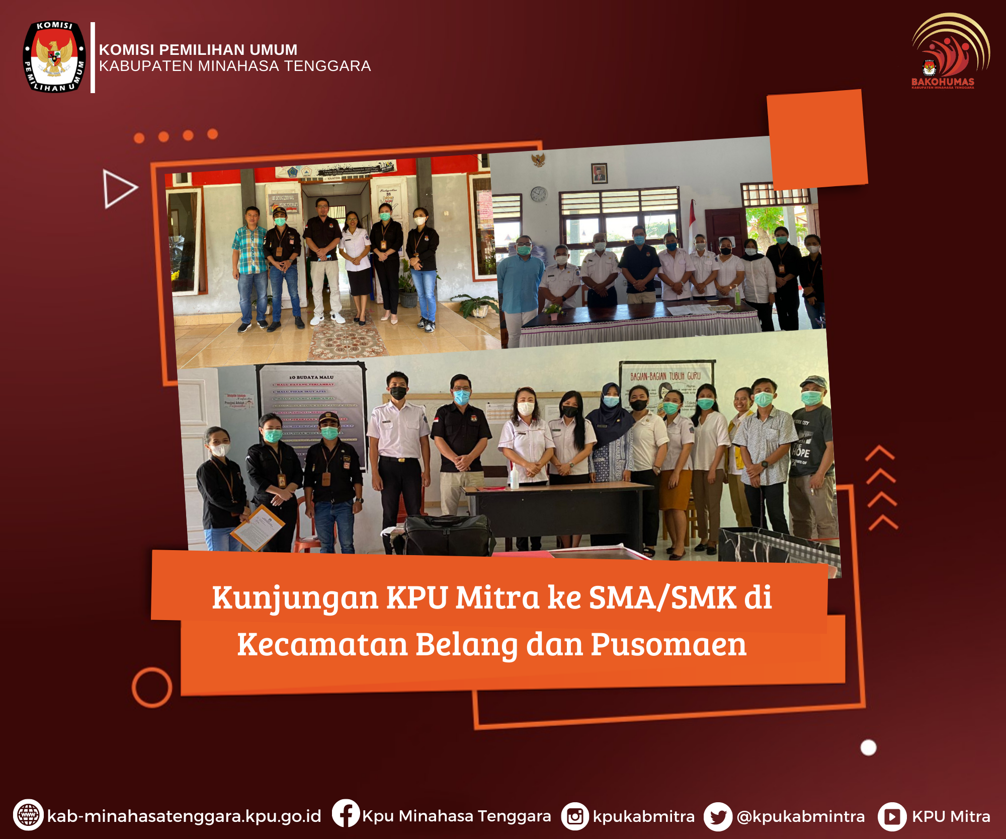 Kunjungan KPU Mitra ke SMAN 1 Belang, SMAN 1 Pusomaen, dan SMK N 1 Pusomaen ini mendapat sambutan hangat dari pihak sekolah baik kepala sekolah maupun guru yang ada. Ketua Divisi Perencanaan Data dan Informasi KPU Mitra Hensly Pelleng menyampaikan maksud dan tujuan kunjungan ini adalah untuk menindaklanjuti MoU antara KPU Provinsi Sulawesi Utara (Sulut) dengan Dinas Pendidikan Sulut terkait permintaan data pemilih pemula guna menunjang program Pemutakhiran Data Pemilih Berkelanjutan (PDPB).