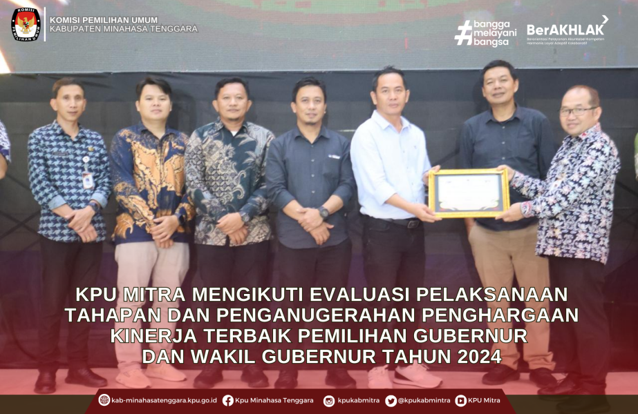 kab-minahasatenggara.kpu.go.id, Ratahan - Komisi Pemilihan Umum Kabupaten Minahasa Tenggara (KPU Mitra) mengikuti Rapat Evaluasi Pelaksanaan Tahapan dan Penganugerahan Penghargaan Kinerja Terbaik Pemilihan Gubernur dan Wakil Gubernur serta Pemilihan Bupati dan Wakil Bupati Kabupaten Minahasa Tenggara Tahun 2024 yang dilaksanakan oleh Komisi Pemilihan Umum Provinsi Sulawesi, Jumat (02/05/2025).
