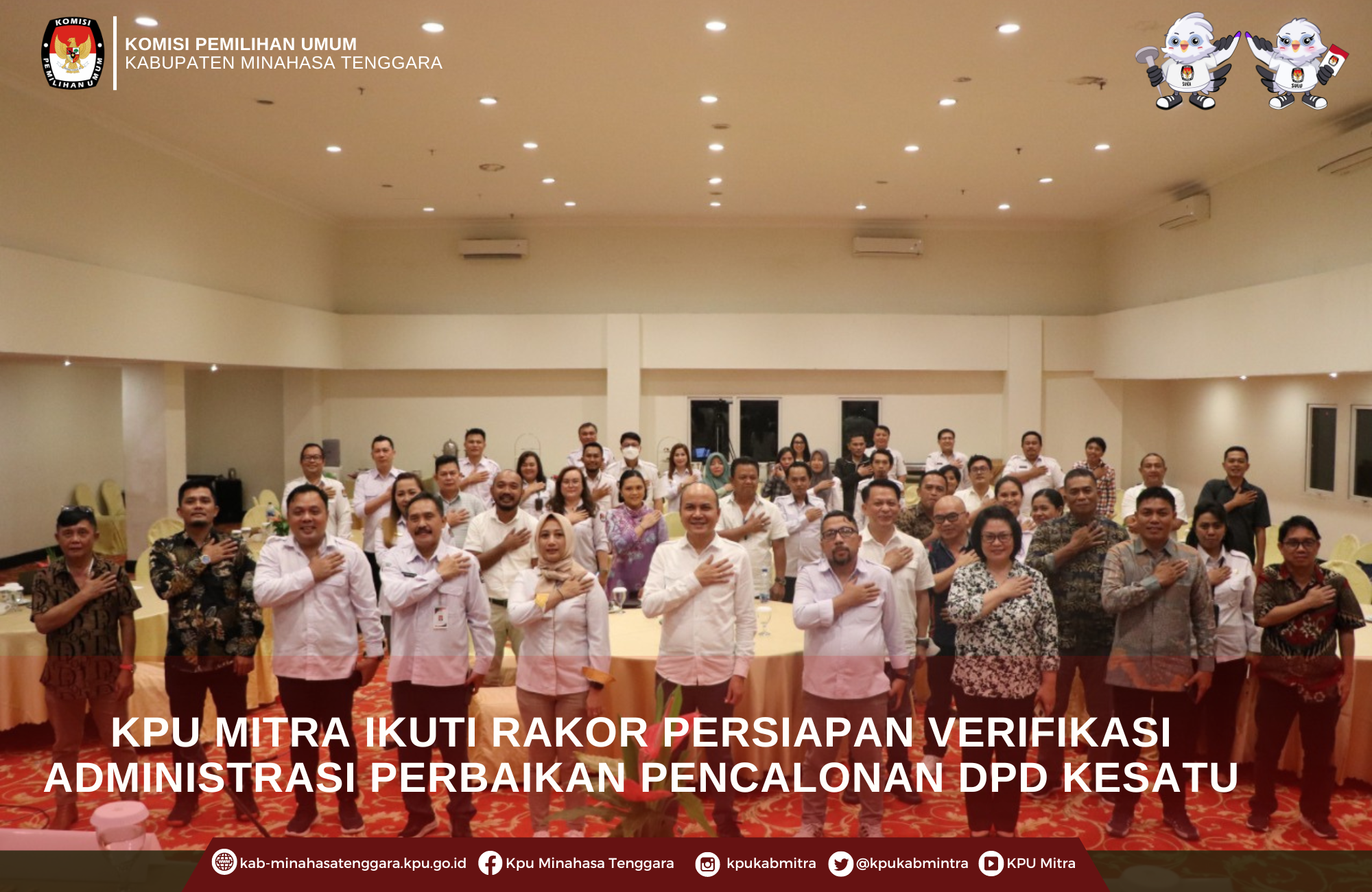 kab-minahasatenggara.kpu.go.id, Ratahan - KPU Kabupaten Minahasa Tenggara (Mitra) mengikuti Rapat Koordinasi Persiapan Verifikasi Administrasi Perbaikan Kesatu Dukungan Minimal Pemilih Bakal Calon Anggota Dewan Perwakilan Daerah Provinsi Sulawesi Utara Bersama KPU Kabupaten/Kota se-Sulawesi Utara yang berlangsung di Hotel Sintesa Peninsula Manado yang berlangsung selama 3 (tiga) hari, sejak tanggal 16-18 Januari 2023.