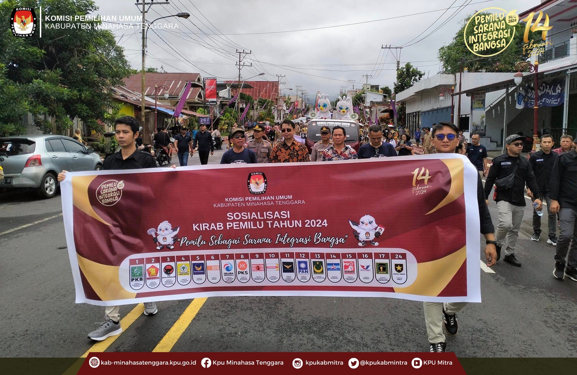 kab-minahasatenggara.kpu.go.id, Ratahan - Komisi Pemilihan Umum (KPU) Minahasa Tenggara (Mitra) menerima penyerahan Kirab Pemilu 2024 dari KPU Kabupaten Minahasa pada Minggu (26/3/2023). Rombongan KPU Kab. Minahasa yang mengantar ke 18 bendera Partai Politik disambut KPU Mitra dengan Marching Band "Gita Abdi Praja IPDN Sulawesi Utara". Kegiatan yang dilaksanakan di halaman kantor KPU Mitra ini dihadiri oleh KPU Provinsi Sulawesi Utara, Pemerintah kabupaten Mitra, dan jajaran Forum Komunikasi Pimpinan Daerah (Forkopimda) Kabupaten Mitra serta partai politik peserta pemilu tahun 2024.