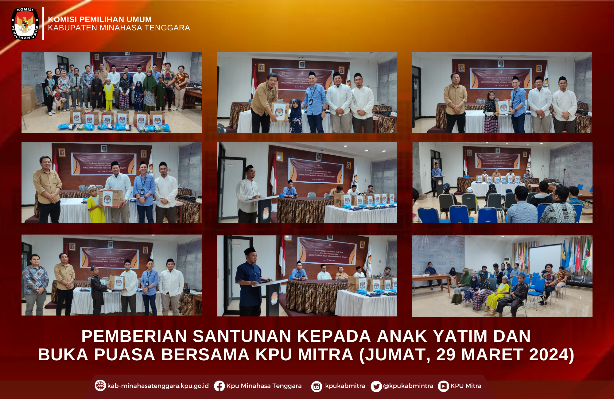 kab-minahasatenggara.kpu.go.id, Ratahan - Komisi Pemilihan Umum (KPU) Kabupaten Minahasa Tenggara (Mitra) melaksanakan kegiatan Santunan dan Buka Puasa Bersama Anak Yatim dalam rangka bentuk kepedulian KPU terhadap sesama, khususnya anak yatim yang membutuhkan kasih sayang dan kebersamaan melalui bersilaturahmi.