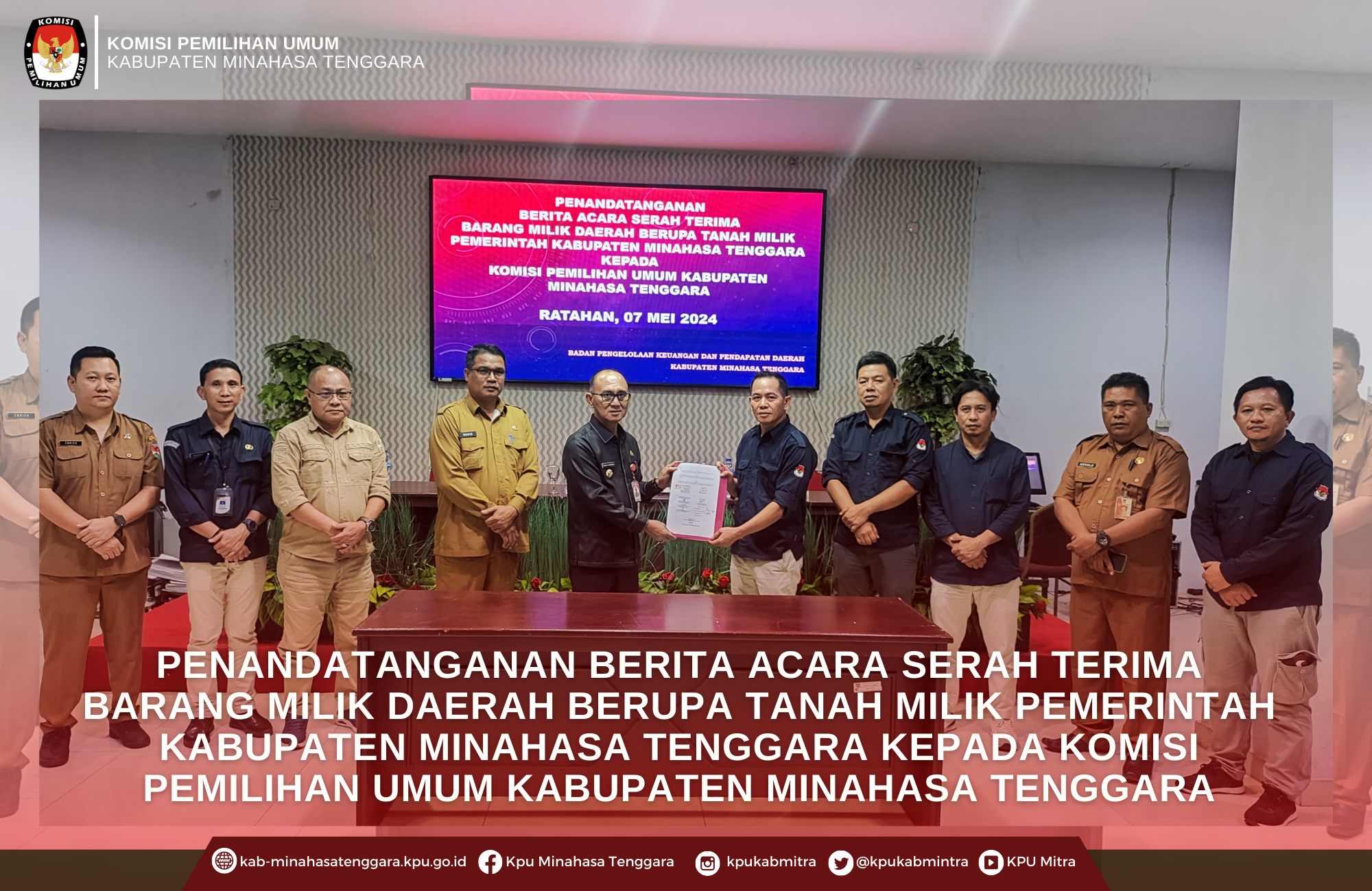 kab-minahasatenggara.kpu.go.id, Ratahan - Komisi Pemilihan Umum (KPU) Kabupaten Minahasa Tenggara (Mitra) menandatangani Berita Acara Serah Terima Barang Milik Daerah Berupa Tanah Milik Pemerintah Kabupaten Minahasa Tenggara Kepada Komisi Pemilihan Umum Kabupaten Minahasa Tenggara, Selasa (7/5/2024).