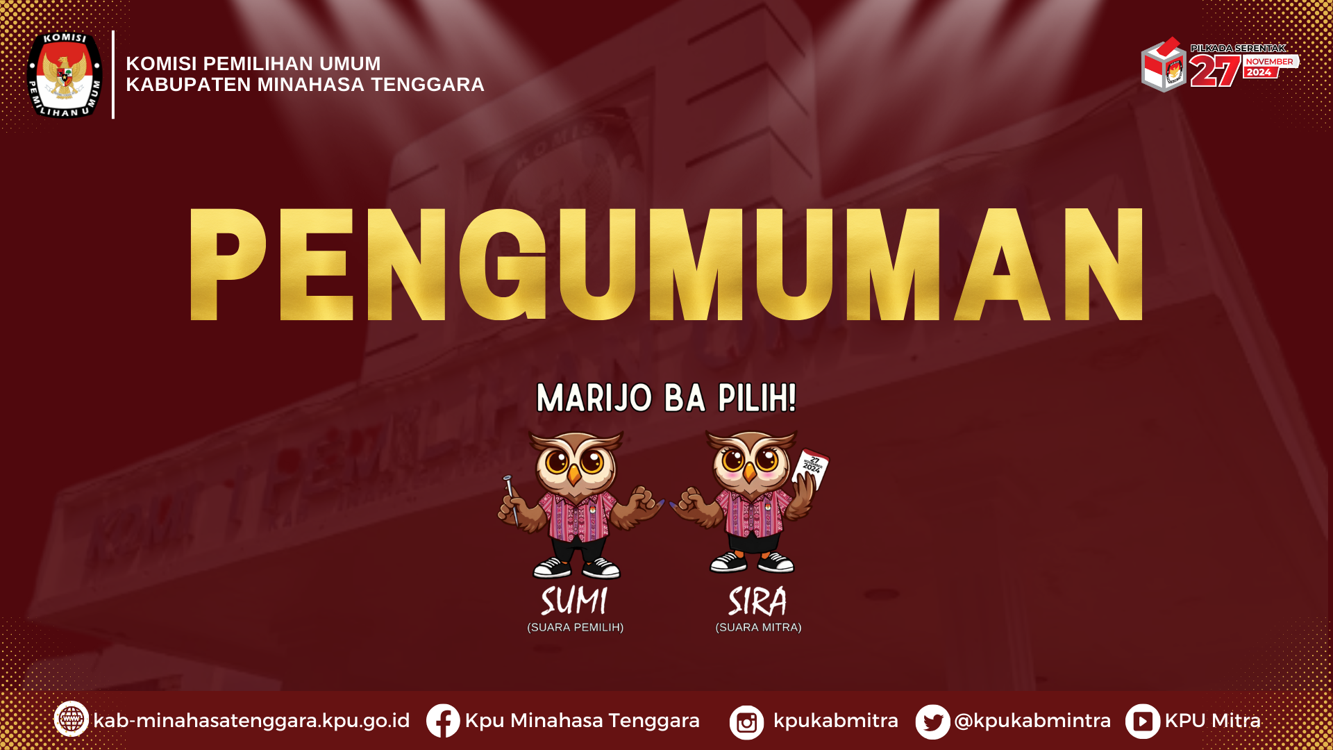Dalam rangka melaksanakan Peraturan Komisi Pemilihan Umum Nomor 2 Tahun 2024 tentang Tahapan dan Jadwal Pemilihan Gubernur dan Wakil Gubernur, Bupati dan Wakil Bupati, serta Walikota dan Wakil Walikota Tahun 2024, Peraturan Komisi Pemilihan Umum Nomor 9 Tahun 2022 tentang Partisipasi Masyarakat Dalam Pemilihan Umum dan Pemilihan Gubernur dan Wakil Gubernur, Bupati dan Wakil Bupati, dan/atau Walikota dan Wakil Walikota, Komisi Pemilihan Umum Kabupaten Minahasa Tenggara mengumumkan pendaftaran Lembaga Survei atau Jajak Pendapat dan Penghitungan Cepat Pemilihan Bupati dan Wakil Bupati Minahasa Tenggara Tahun 2024.