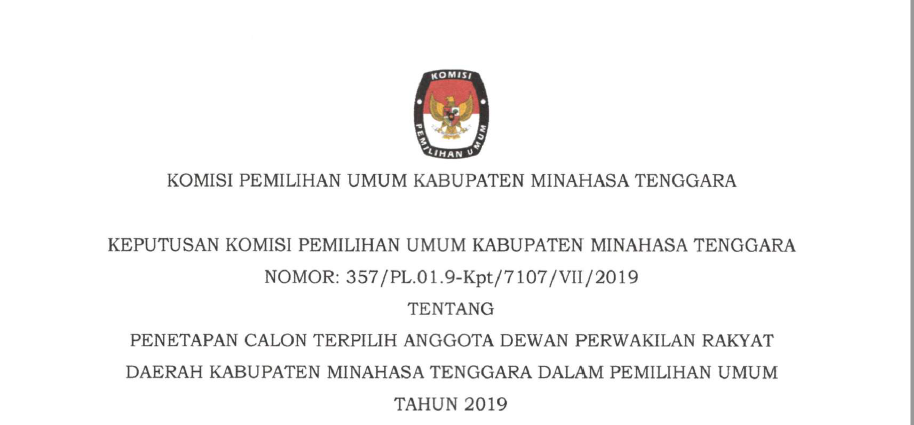 Komisi Pemilihan Umum Kabupaten Minahasa Tenggara mengumumkan Penetapan Calon Terpilih Anggota Dewan Perwakilan Rakyat Daerah Kabupaten Minahasa Tenggara Dalam Pemilihan Umum Tahun 2019.