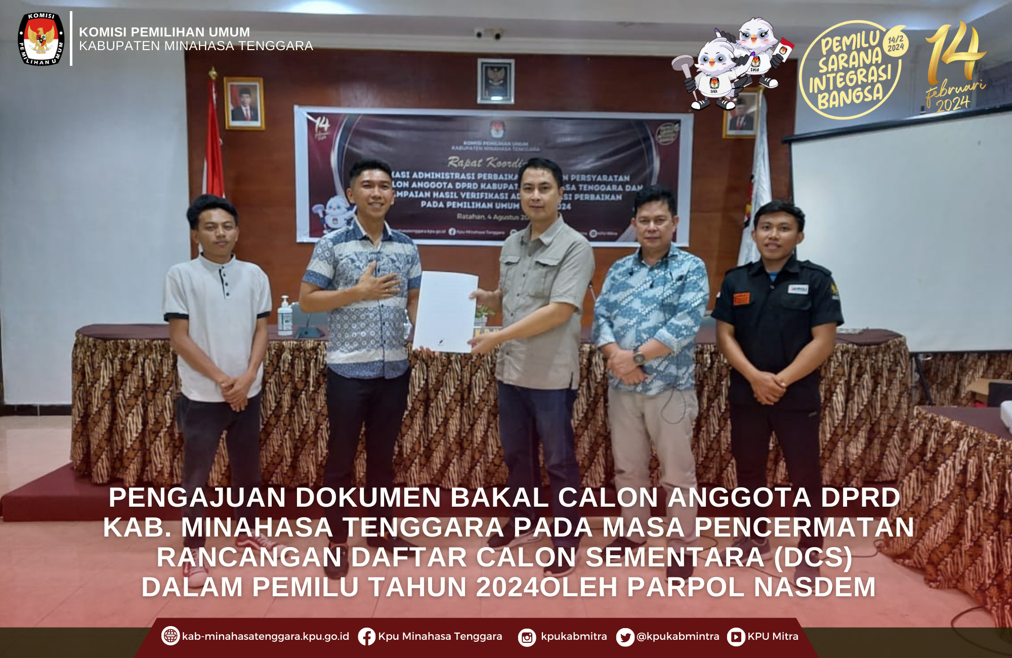 kab-minahasatenggara.kpu.go.id, Ratahan - Partai NasDem telah mengajukan Dokumen Bakal Calon Anggota Dewan Perwakilan Rakyat Daerah Kabupaten Minahasa Tenggara (Mitra) Pada Masa Pencermatan Rancangan Daftar Calon Sementara (DCS) Dalam Pemilu Tahun 2024. Proses pengajuan dilakukan oleh LO Partai Nasdem Mitra Harvey Pelleng di kantor KPU Mitra, Jumat (11/08/2023).