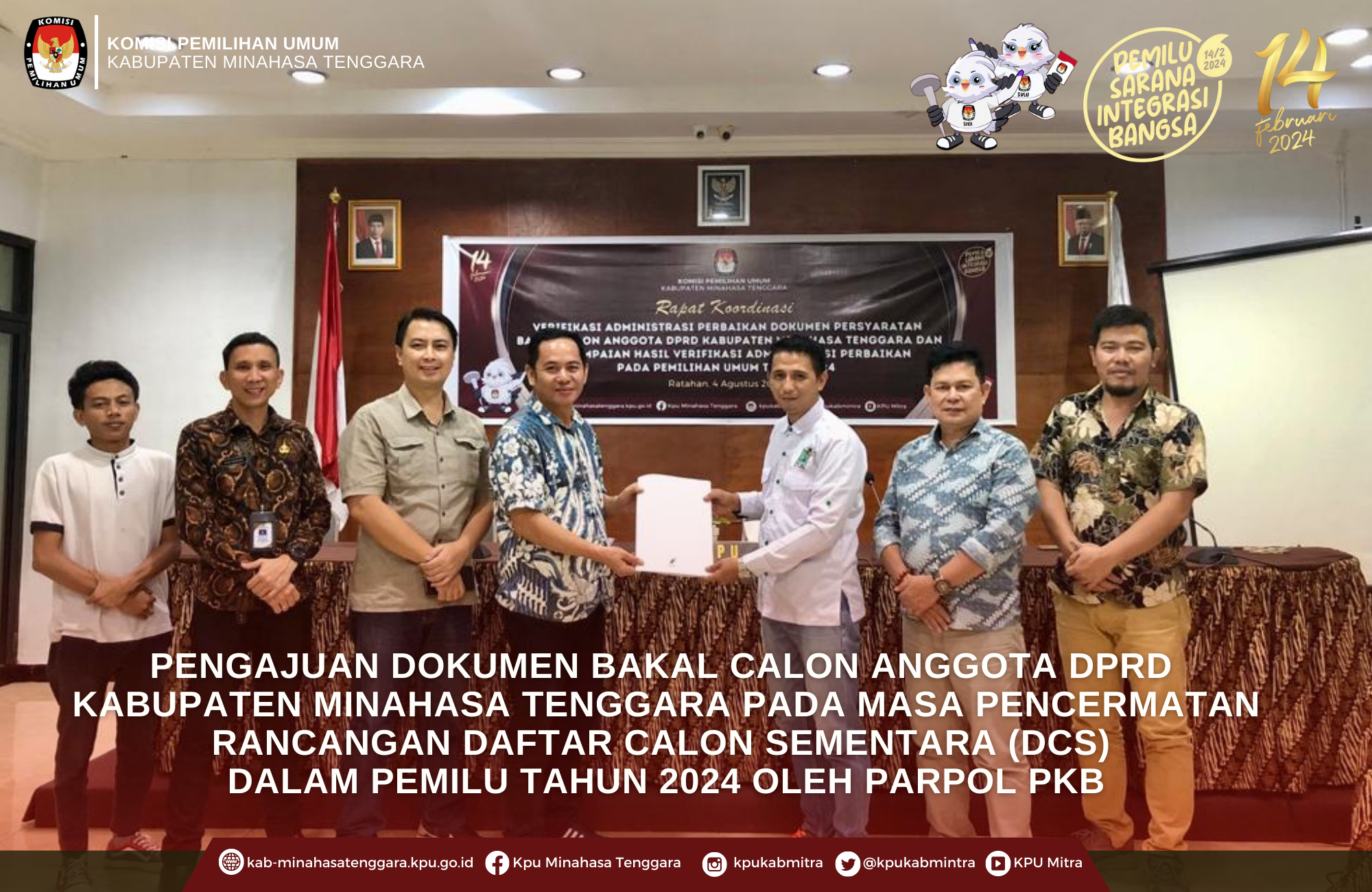 kab-minahasatenggara.kpu.go.id, Ratahan - Partai Kebangkitan Bangsa (PKB) telah mengajukan Dokumen Bakal Calon Anggota Dewan Perwakilan Rakyat Daerah Kabupaten Minahasa Tenggara (Mitra) Pada Masa Pencermatan Rancangan Daftar Calon Sementara (DCS) Dalam Pemilu Tahun 2024. Proses pengajuan dilakukan oleh LO Partai PKB Mitra Sudirta Lasabuda di kantor KPU Mitra, Jumat (11/08/2023).