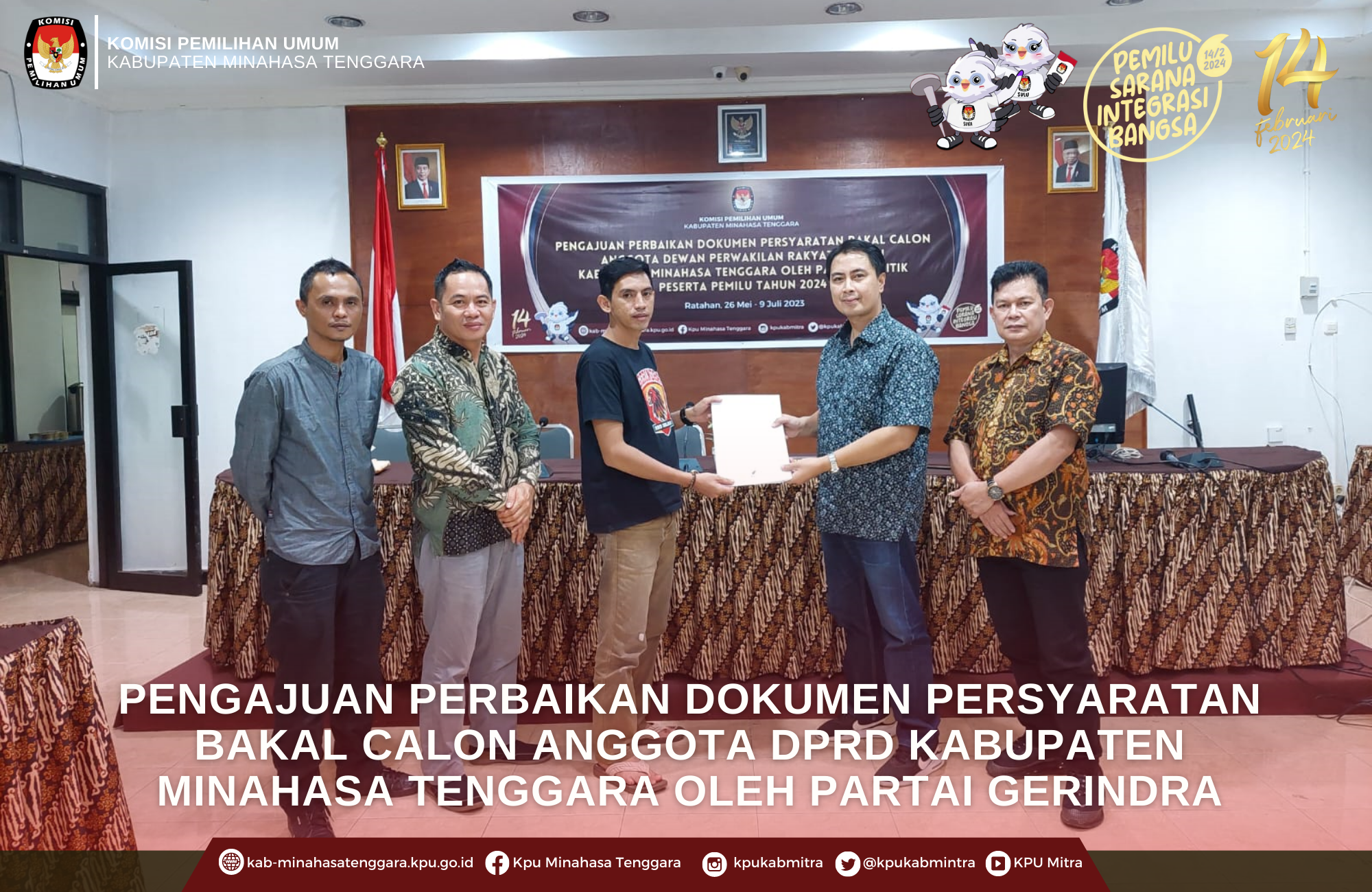 kab-minahasatenggara.kpu.go.id, Ratahan - Komisi Pemilihan Umum (KPU) Kabupaten Minahasa Tenggara (Mitra) menerima pengajuan perbaikan dokumen persyaratan bakal calon anggota DPRD kabupaten Mitra Pemilu Tahun 2024 dari Partai Gerakan Indonesia Raya (Gerindra), Minggu (9/7/2023).