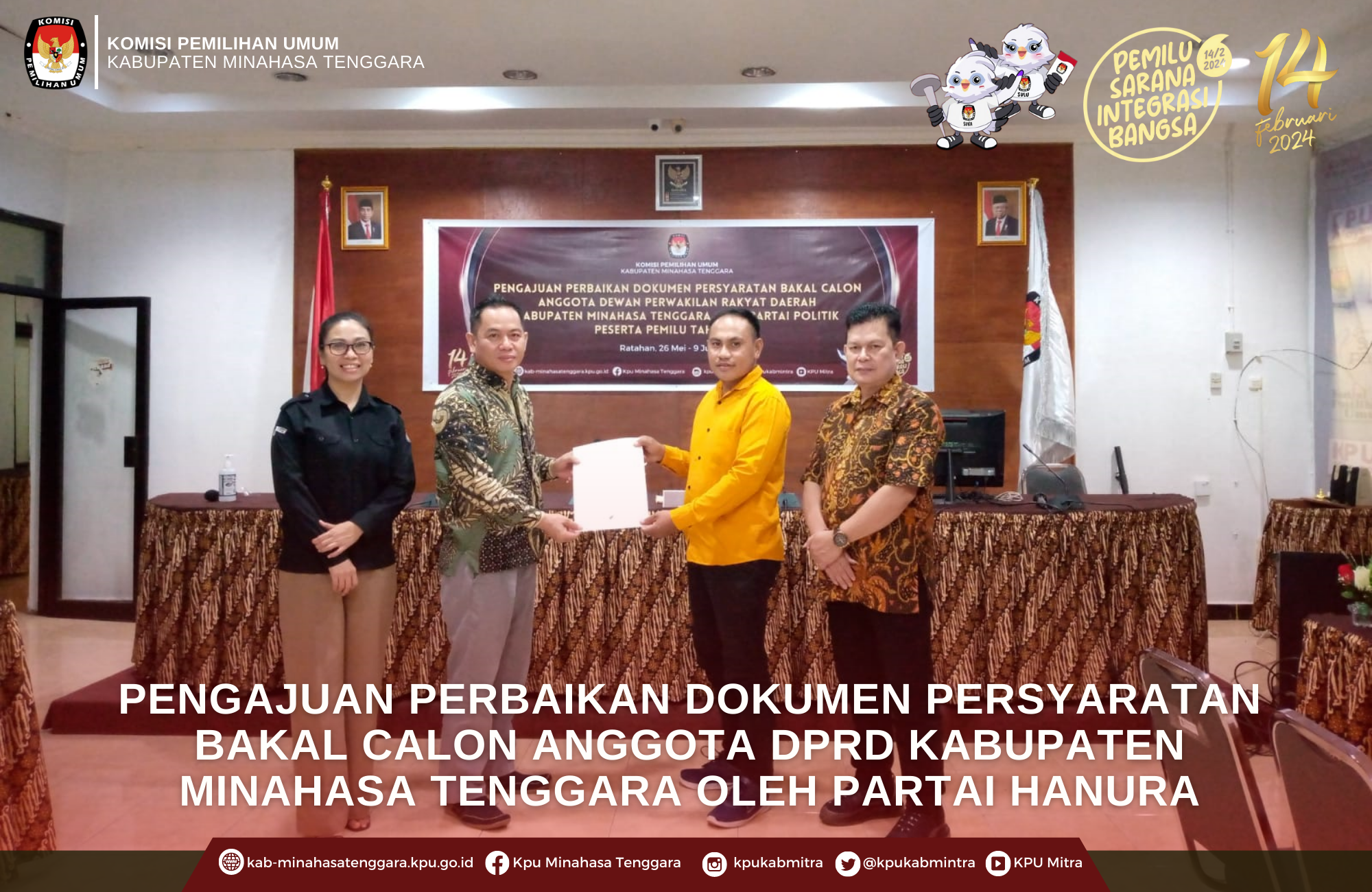kab-minahasatenggara.kpu.go.id, Ratahan - Komisi Pemilihan Umum (KPU) Kabupaten Minahasa Tenggara (Mitra) menerima pengajuan perbaikan dokumen persyaratan bakal calon anggota DPRD kabupaten Mitra Pemilu Tahun 2024 dari Partai Hati Nurani Rakyat (Hanura), Minggu (9/7/2023).