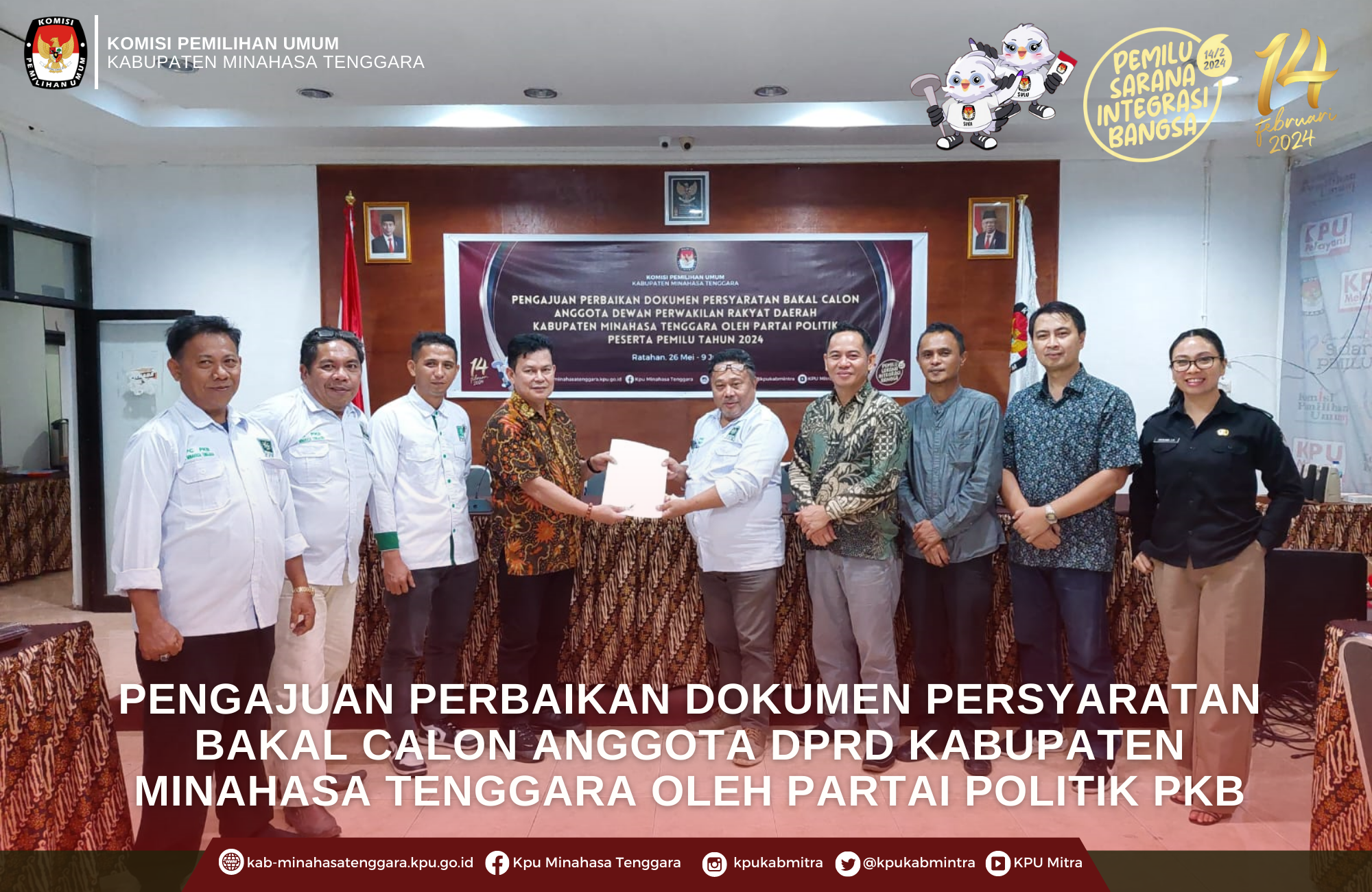 kab-minahasatenggara.kpu.go.id, Ratahan - Komisi Pemilihan Umum (KPU) Kabupaten Minahasa Tenggara (Mitra) menerima pengajuan perbaikan dokumen persyaratan bakal calon anggota DPRD kabupaten Mitra Pemilu Tahun 2024 dari Partai Kebangkitan Bangsa (PKB), Minggu (9/7/2023).