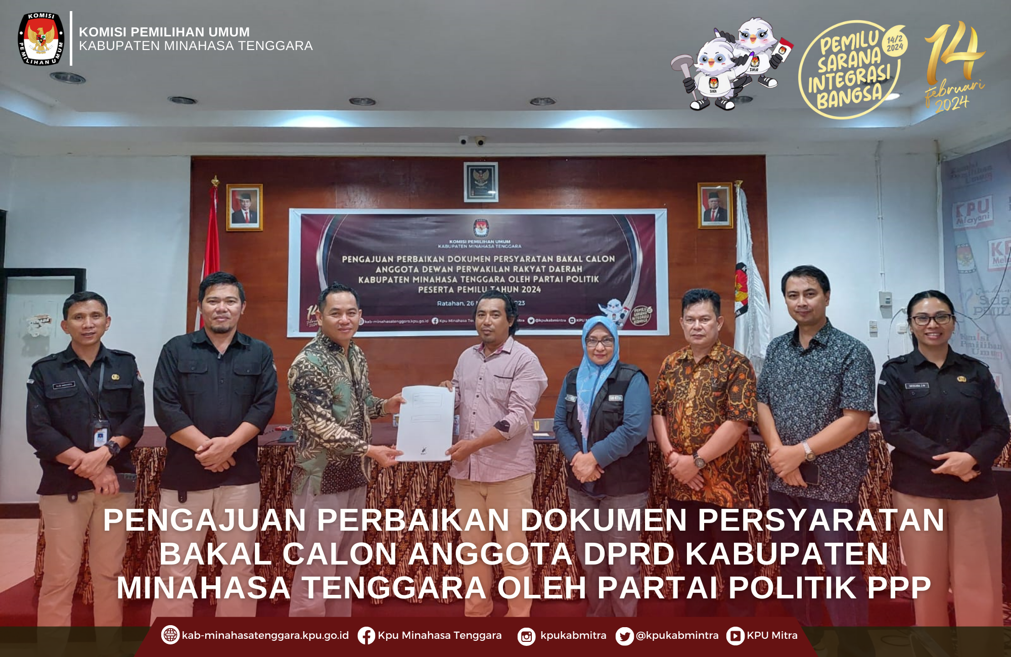 kab-minahasatenggara.kpu.go.id, Ratahan - Komisi Pemilihan Umum (KPU) Kabupaten Minahasa Tenggara (Mitra) menerima pengajuan perbaikan dokumen persyaratan bakal calon anggota DPRD kabupaten Mitra Pemilu Tahun 2024 dari Partai Persatuan Pembangunan (PPP), Minggu (9/7/2023).