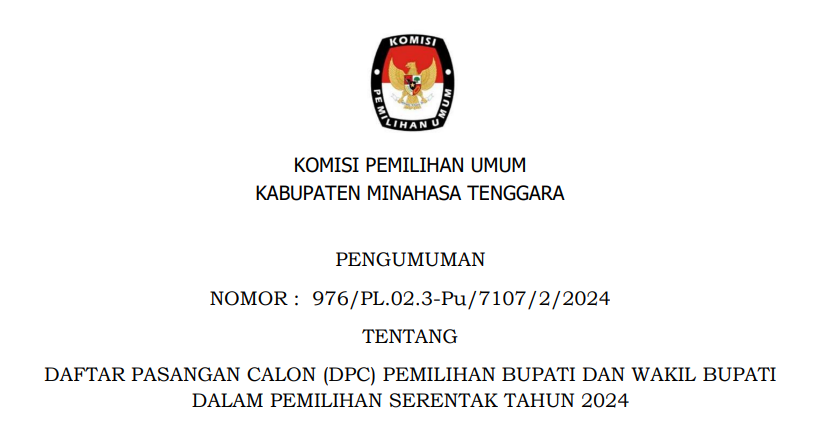 Pengumuman Daftar Pasangan Calon (DPC) Pemilihan Bupati dan Wakil Bupati Minahasa Tenggara dalam Pemilihan Serentak Tahun 2024