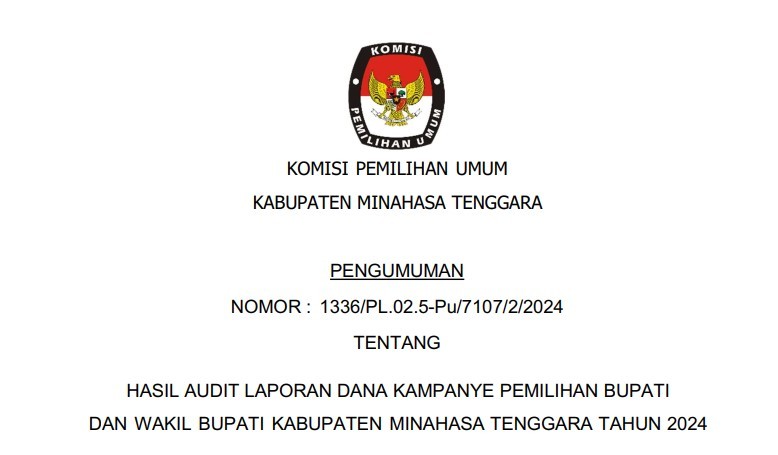 PENGUMUMAN HASIL AUDIT LAPORAN DANA KAMPANYE PEMILIHAN BUPATI DAN WAKIL BUPATI KABUPATEN MINAHASA TENGGARA TAHUN 2024