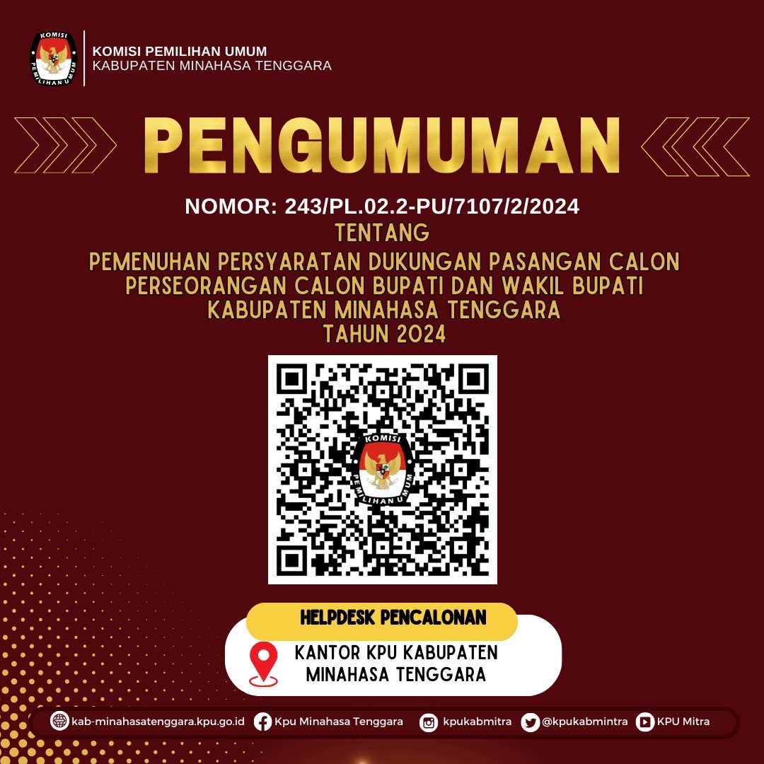 Berdasarkan Ketentuan Pasal 41 ayat (2) Undang-Undang Nomor 10 Tahun 2016 tentang Perubahan Kedua Atas Undang-Undang Nomor 1 Tahun 2015 tentang Penetapan Peraturan Pemerintah Pengganti Undang-Undang Nomor 1 Tahun 2014 tentang Pemilihan Gubernur, Bupati, dan Walikota Menjadi Undang-Undang serta Peraturan Komisi Pemilihan Umum Nomor 2 Tahun 2024 tentang Tahapan dan Jadwal Pemilihan Gubernur dan Wakil Gubernur, Bupati dan Wakil Bupati, serta Walikota dan Wakil Walikota Tahun 2024, maka Komisi Pemilihan Umum Kabupaten Minahasa Tenggara mengumumkan Pemenuhan Persyaratan Dukungan Pasangan Calon Perseorangan Calon Bupati dan Wakil Bupati Kabupaten Minahasa Tenggara Tahun 2024.