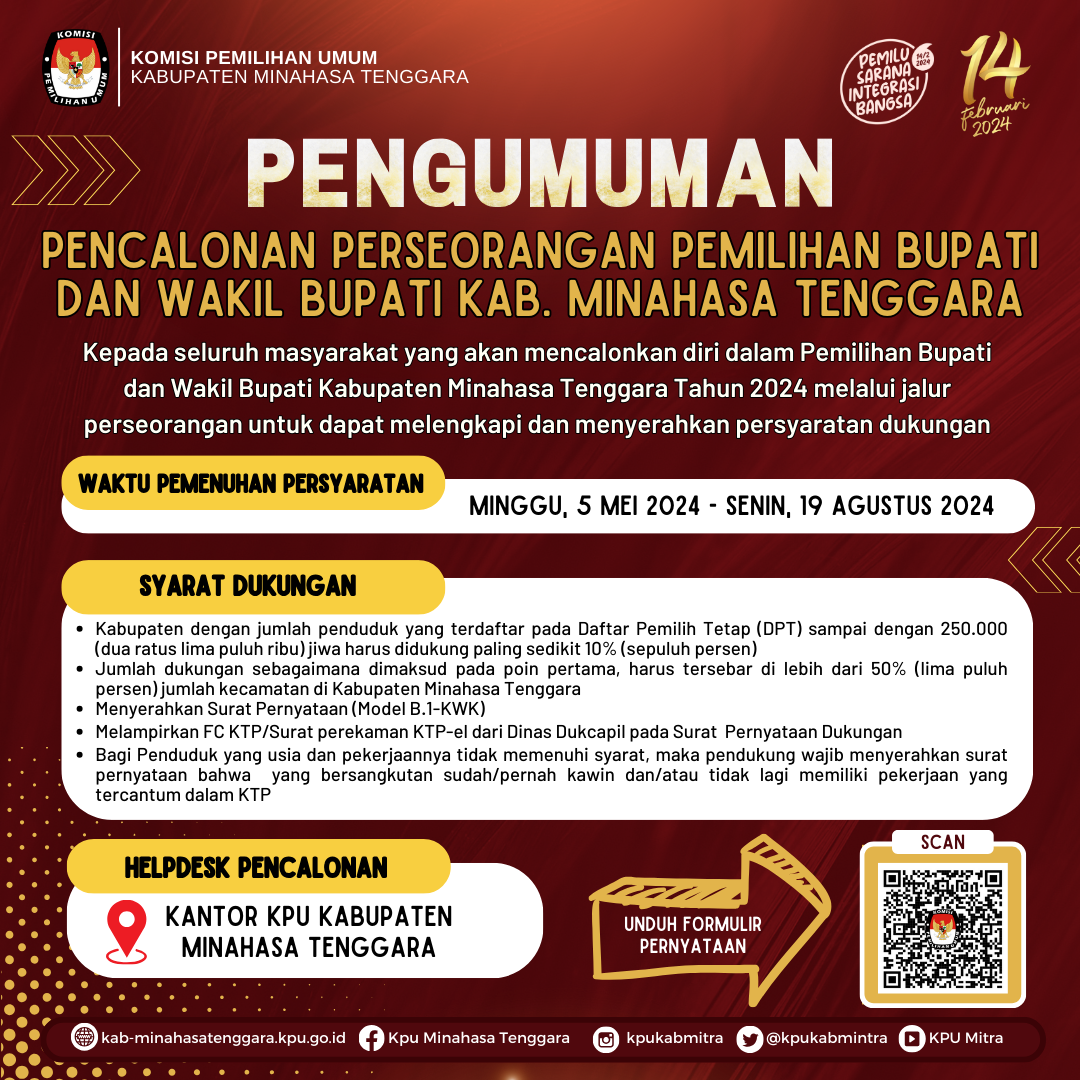 Berikut Pengumuman Pencalonan Perseorangan Pemilihan Bupati dan Wakil Bupati Kabupaten Minahasa Tenggara.