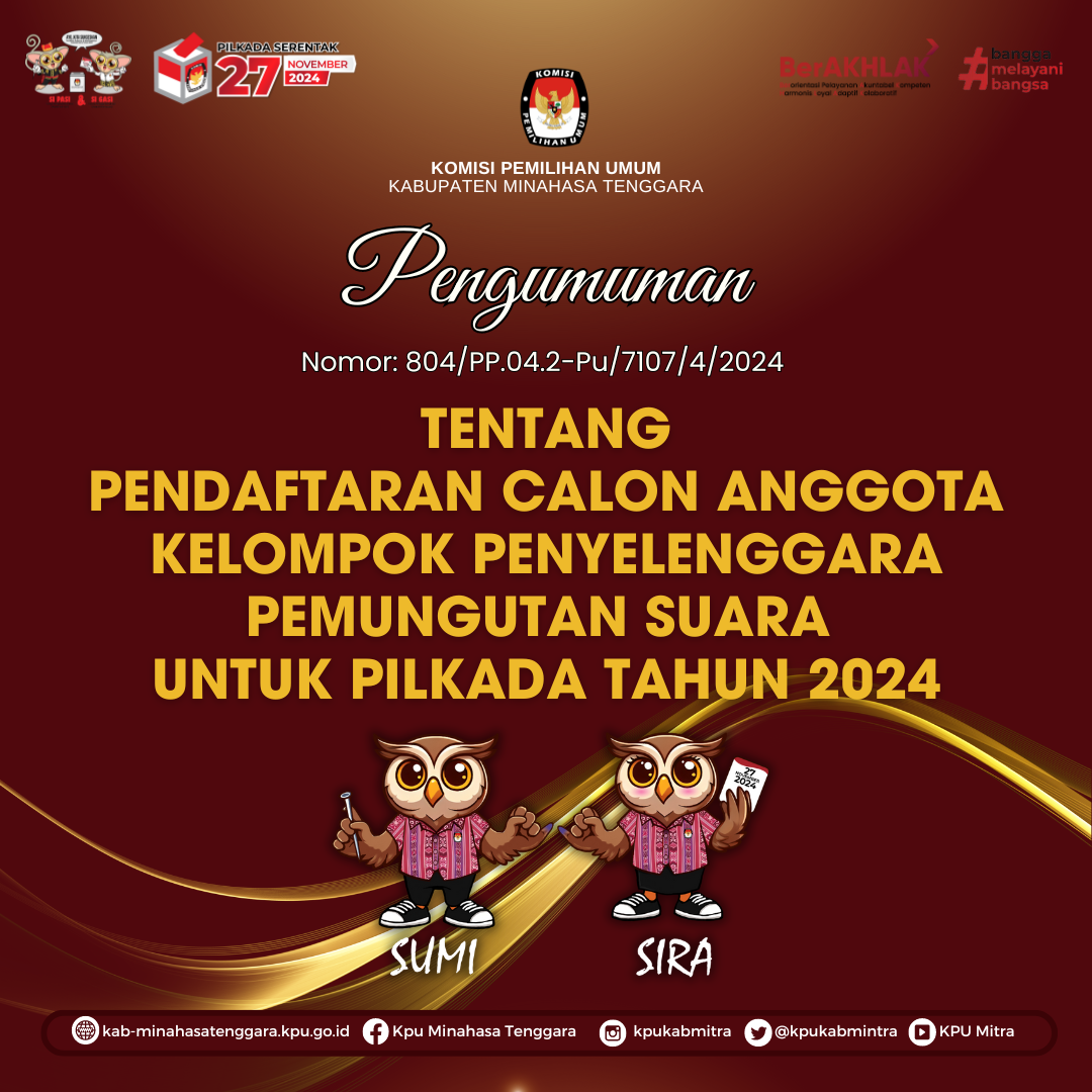 Dalam rangka pembentukan KPPS untuk Pemilihan Gubernur dan Wakil Gubernur, Bupati dan Wakil Bupati Tahun 2024, Komisi Pemilihan Umum Kabupaten Minahasa Tenggara mengundang Warga Negara Indonesia yang memenuhi persyaratan untuk mendaftarkan diri menjadi anggota KPPS untuk Pemilihan Gubernur dan Wakil Gubernur, Bupati dan Wakil Bupati Tahun 2024.