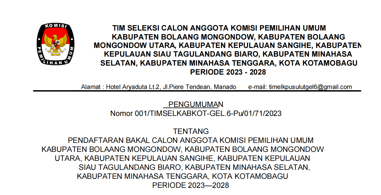Pengumuman Pendaftaran Calon Anggota Komisi Pemilihan Umum Kabupaten Bolmong, Bolmut, Sangihe, Sitaro, Minsel, Mitra dan Kota Kotamobagu