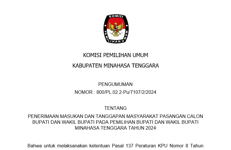 Bahwa untuk melaksanakan ketentuan Pasal 137 Peraturan Komisi Pemilihan Umum Nomor 8 Tahun 2024 tentang Pencalonan Gubernur dan Wakil Gubernur, Bupati dan Wakil Bupati, serta Walikota dan Wakil Walikota yang telah diubah dengan Peraturan Komisi Pemilihan Umum Nomor 10 Tahun 2024 tentang Perubahan Atas Peraturan Komisi Pemilihan Umum Nomor 8 Tahun 2024 tentang Pencalonan Gubernur dan Wakil Gubernur, Bupati dan Wakil Bupati, serta Walikota dan Wakil Walikota, Komisi Pemilihan Umum Kabupaten Minahasa Tenggara mengumumkan Penerimaan Masukan dan Tanggapan Masyarakat terhadap Pasangan Calon Bupati Dan Wakil Bupati Kabupaten Minahasa Tenggara sebagai berikut: