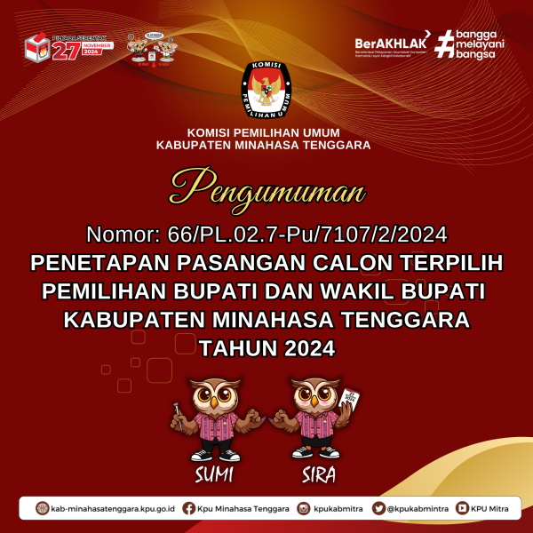 PENGUMUMAN PENETAPAN PASANGAN CALON BUPATI DAN WAKIL BUPATI TERPILIH KABUPATEN MINAHASA TENGGARA DALAM PEMILIHAN TAHUN 2024