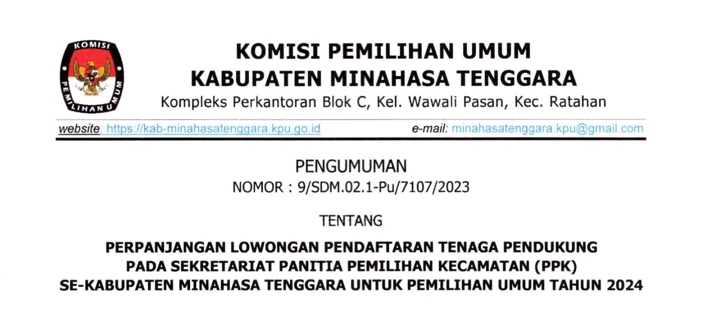 Pengumuman Perpanjangan Lowongan Pendaftaran Tenaga Pendukung Pada Sekretariat Panitia Pemilihan Kecamatan (PPK) Tombatu dan Tombatu Timur Untuk Pemilihan Umum Tahun 2024