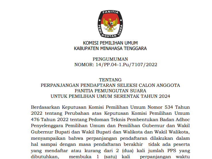 kab-minahasatenggara.kpu.go.id Ratahan - Komisi Pemilihan Umum Kabupaten Minahasa Tenggara (KPU Mitra) mengumumkan perpanjangan pendaftaran Panitia Pemungutan Suara (PPS) Untuk Pemilihan Umum Tahun 2024.