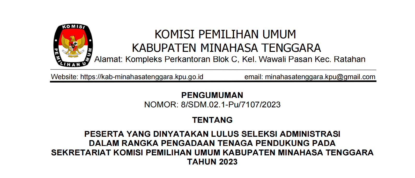 Pengumuman Peserta yang Dinyatakan Lulus Administrasi Dalam Rangka Pengadaan Tenaga Pendukung Pada Sekretariat KPU Kabupaten Minahasa Tenggara Tahun 2023