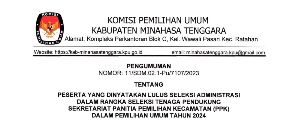Pengumuman Peserta Yang Dinyatakan Lulus Seleksi Administrasi Dalam Rangka Seleksi Tenaga Pendukung Sekretariat PPK Dalam Pemilihan Umum Tahun 2024