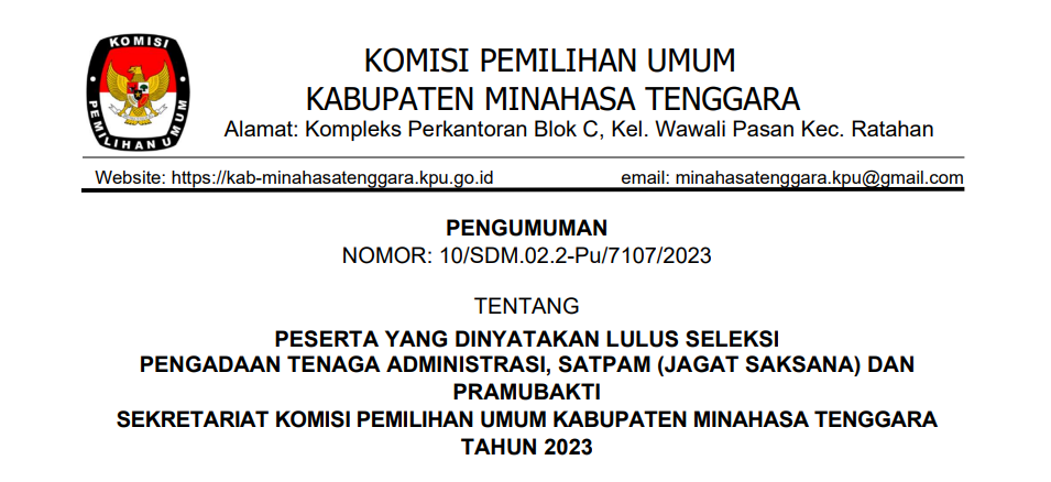 Pengumuman Peserta Yang Dinyatakan Lulus Seleksi Pengadaan Tenaga Administrasi, Satpam (Jagat Saksana), dan Pramubakti Sekretariat KPU Kabupaten Minahasa Tenggara Tahun 2023
