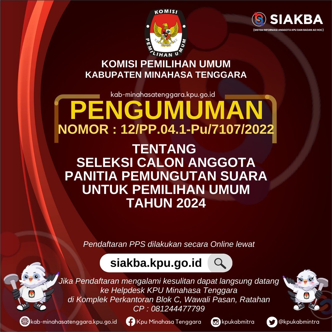 kab-minahasatenggara.kpu.go.id Ratahan - Komisi Pemilihan Umum Kabupaten Minahasa Tenggara (KPU Mitra) memberikan kesempatan bagi Warga Negara Indonesia yang memenuhi syarat untuk mendaftarkan diri menjadi anggota Panitia Pemungutan Suara (PPS).