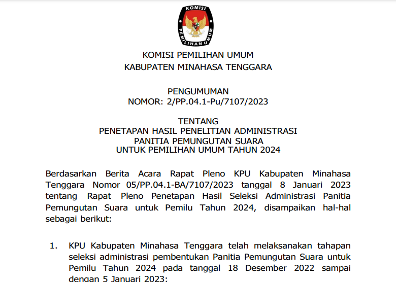 kab.minahasatenggara.kpu.go.id, Ratahan - Komisi Pemilihan Umum Kabupaten Minahasa Tenggara (KPU Mitra) mengumumkan hasil penelitian administrasi Panitia Pemungutan SUara (PPS) untuk Pemilihan Umum Tahun 2024.