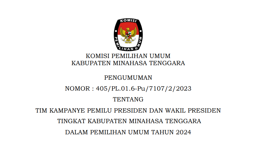 kab-minahasatenggara.kpu.go.id, Ratahan - Pengumuman Komisi Pemilihan Umum Kabupaten Minahasa Tenggara nomor: 405/PL.01.6-Pu/7107/2/2023 Tentang Tim Kampanye Pemilu Presiden dan Wakil Presiden Tingkat Kabupaten Minahasa Tenggara Dalam Pemilihan Umum Tahun 2024.