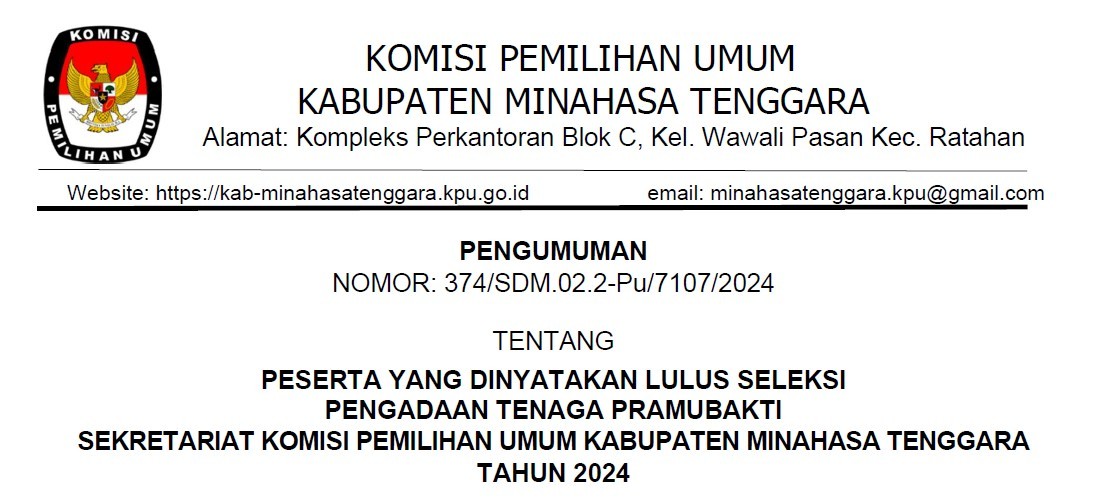 Berdasarkan hasil seleksi wawancara, maka bersama ini diumumkan peserta seleksi yang dinyatakan lulus seleksi wawancara sebagai Tenaga Pramubakti di Sekretariat KPU Kabupaten Minahasa Tenggara.
