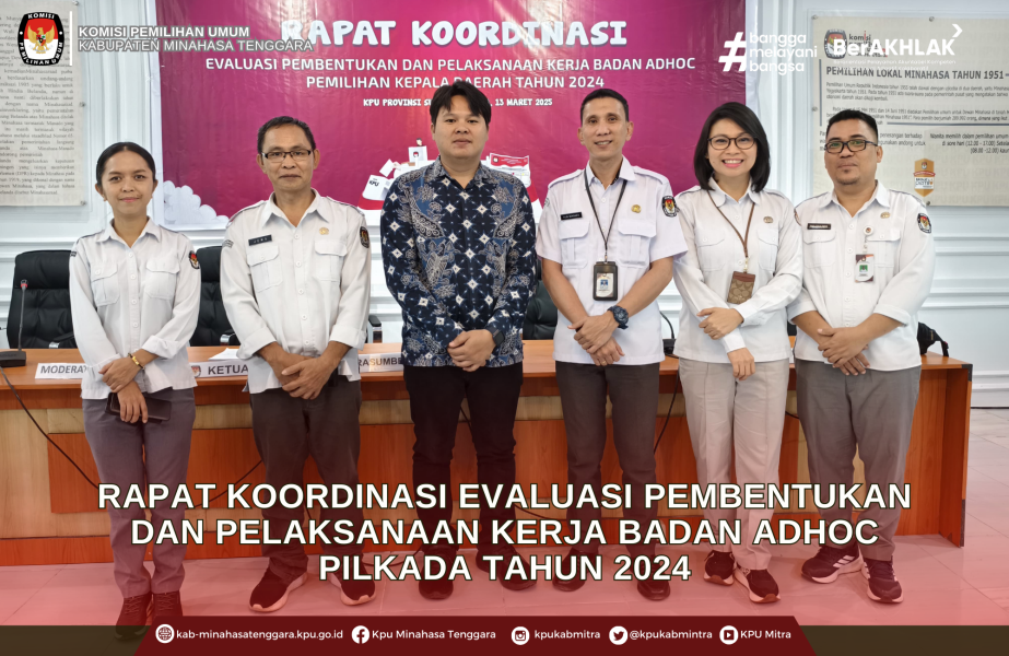 kab-minahasatenggara.kpu.go.id, Ratahan - Komisi Pemilihan Umum Kabupaten Minahasa Tenggara (KPU Mitra) mengikuti Rapat Koordinasi Evaluasi Pembentukan dan Pelaksanaan Kerja Badan Adhoc Pilkada Tahun 2024 yang dilaksanakan pada Kamis,13 Maret 2025 – Jumat, 14 Maret 2025, di Kantor KPU Provinsi Sulawesi Utara.
