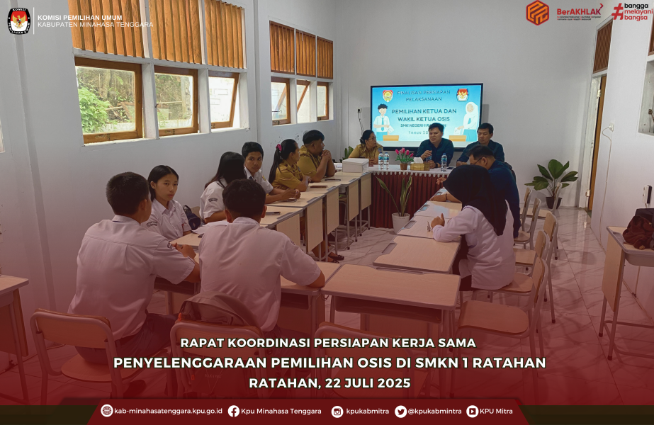 Ratahan, Minahasa Tenggara – Komisi Pemilihan Umum (KPU) Kabupaten Minahasa Tenggara bekerja sama dengan SMKN 1 Ratahan menggelar rapat koordinasi dan finalisasi pelaksanaan Pemilihan Ketua dan Wakil Ketua OSIS pada Selasa (22/7). Rapat ini secara khusus membahas kesiapan teknis penyelenggaraan, mulai dari tahapan pencalonan, kampanye, hingga pemungutan dan penghitungan suara yang dirancang menyerupai proses pemilu sesungguhnya. Kegiatan ini turut dihadiri oleh Ketua Divisi Sosialisasi, Pendidikan Pemilih, Partisipasi Masyarakat dan SDM KPU Minahasa Tenggara, Lucky Mamahit, Ketua Divisi Teknis Penyelenggaraan Pemilu Ryan J. Sandag, serta staf KPU lainnya yang memberikan arahan dan pendampingan teknis.