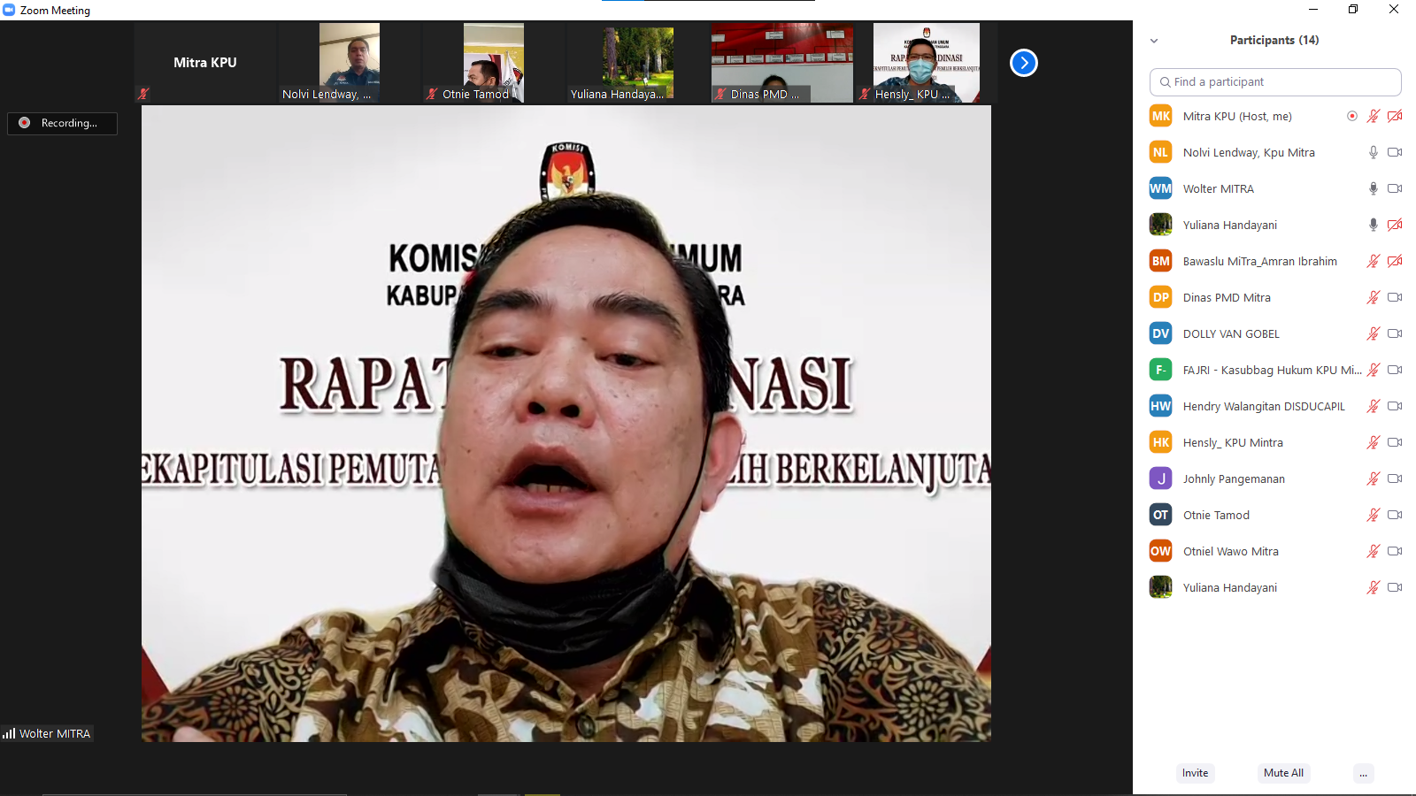 RATAHAN - Komisi Pemilihan Umum (KPU) Kabupaten Minahasa Tenggara (Mitra) kembali menggelar Rapat Koordinasi Rekapitulasi Pemutakhiran Data Pemilih Berkelanjutan (PDPB) Periode Juli 2021 via Zoom Meeting (daring), Rabu 03/08/2021.