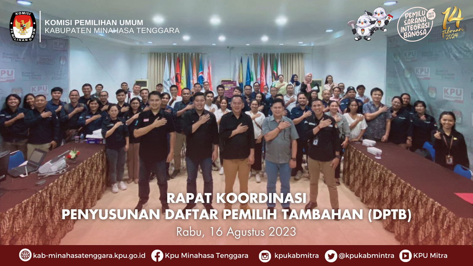 RATAHAN - Dalam rangka menindaklanjuti Surat Ketua KPU RI Nomor 695/PL.01-SD/14/2023, KPU Kabupaten Minahasa Tenggara menggelar Rapat Koordinasi Penyusunan Daftar Pemilih Tambahan (DPTb) dalam Pemilihan Umum Tahun 2024 di Kantor KPU Kabupaten Minahasa Tenggara pada Rabu (16/08/2023).