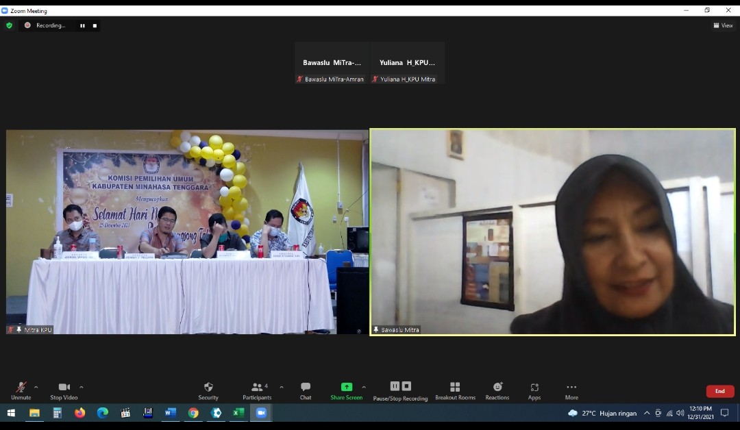 Kegiatan yang dilaksanakan di ruang rapat KPU Mitra ini dihadiri oleh Komisioner dan jajaran Sekretariat, adapun Bawaslu mengikuti secara daring lewat aplikasi Zoom.