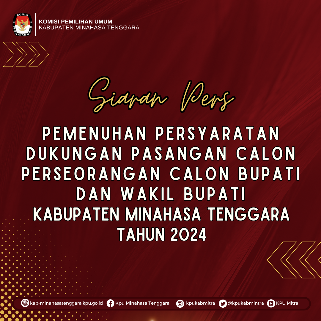 Berikut Siaran Pers Pemenuhan Persyaratan Dukungan Pasangan Calon Perseorangan Calon Bupati dan Wakil Bupati Kabupaten Minahasa Tenggara Tahun 2024.