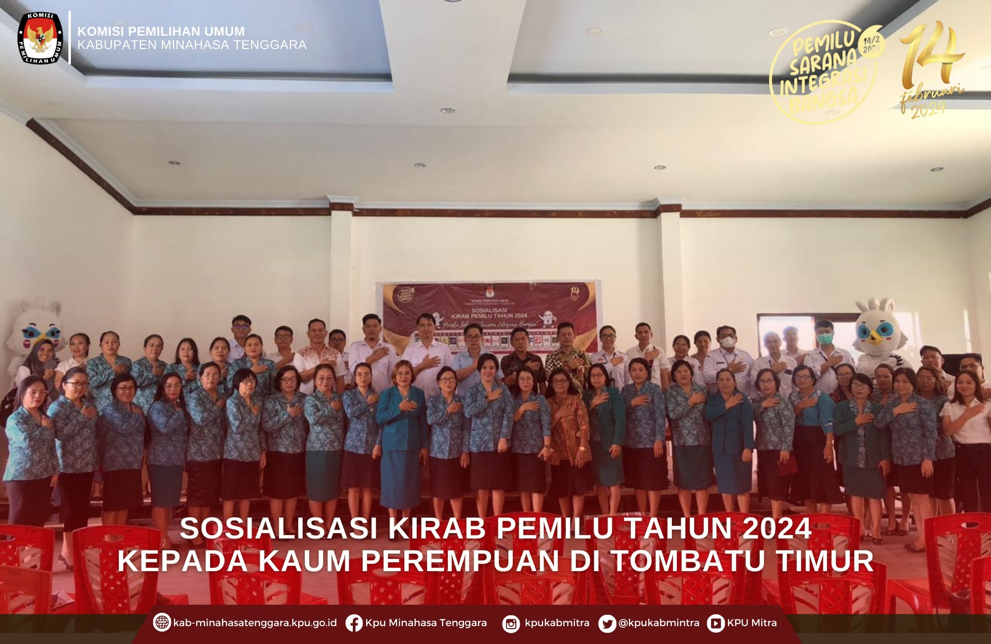 kab-minahasatenggara.kpu.go.id, Ratahan - Komisi Pemilihan Umum (KPU) Minahasa Tenggara (Mitra) melakukan sosialisasi Kirab Pemilu 2024 kepada pemilih perempuan yang bertempat di Kecamatan Tombatu Timur pada Kamis (30/03/2023). Kegiatan ini diisi dengan penyampaian materi dari komisioner KPU Mitra diantaranya Wolter Dotulong selaku Ketua KPU Mitra, Otniel Wawo selaku Ketua Divisi Sosialisasi, Pendidikan Pemilih dan Pertisipasi Masyarakat serta SDM, Johnly Pangemanan selaku Ketua Divisi Teknis Penyelenggaraan serta Otnie Tamod selaku Ketua Divisi Hukum dan Pengawasan KPU Mitra.