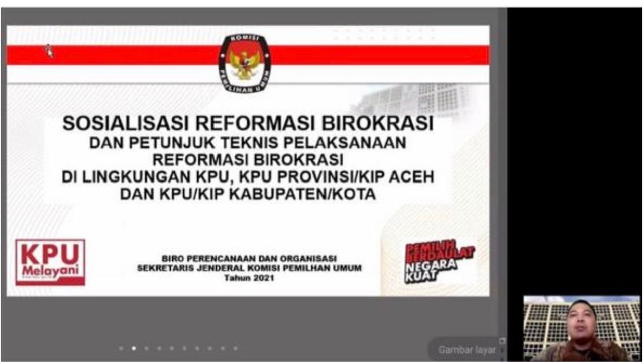 Ratahan - Komisi Pemilihan Umum Kabupaten Minahasa Tenggara mengikuti Rapat Sosialisasi Program Reformasi Birokrasi se-Sulawesi Utara, Jumat (16/07/21). Rapat Sosialisasi Program Reformasi Birokrasi dibuka oleh Ketua KPU Provinsi Sulawesi Utara Bapak Ardiles Mewoh dan dilanjutkan arahan oleh para Komisioner. Selanjutnya Sosialisasi Reformasi Birokrasi disampaikan oleh Narasumber dari Tenaga Ahli Brio SDM KPU RI Bapak Windra.