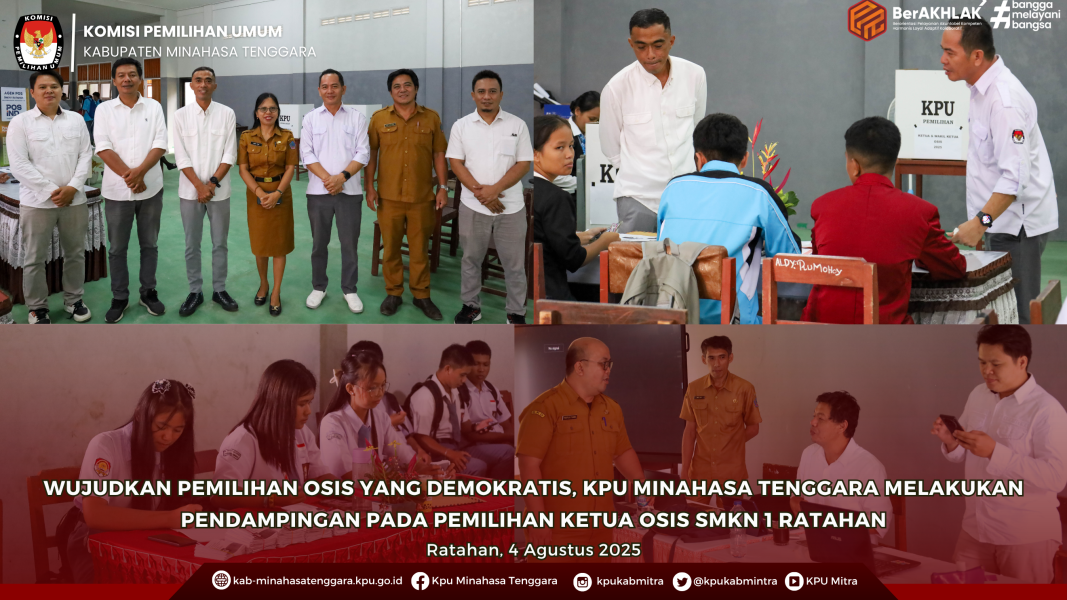 Ratahan– Pemilihan Ketua dan Wakil Ketua OSIS di SMK Negeri 1 Ratahan sukses digelar pada Senin, 4 Agustus 2025. Tiga pasangan calon bersaing dalam pesta demokrasi pelajar yang berlangsung tertib, lancar, dan penuh antusiasme. Kegiatan ini mendapat pendampingan langsung dari Komisi Pemilihan Umum (KPU) Kabupaten Minahasa Tenggara sejak dari awal tahapan Pemilihan sampai dengan proses pelaksanaan Pemungutan Suara. Hal ini dilakukan dalam rangka Sosialisasi dan Pendidikan Pemilih kepada Pelajar, kegiatan ini selain dihadiri oleh Ketua dan Anggota KPU Minahasa Tenggara, turut hadir juga Ketua Divisi Sosialisasi, Pendidikan Pemilih, dan Partisipasi Masyarakat (Sosdiklih Parmas) KPU Provinsi Sulawesi Utara, Awaluddin Umbola, yang memberikan apresiasi atas semangat demokrasi yang ditunjukkan para Siswa.