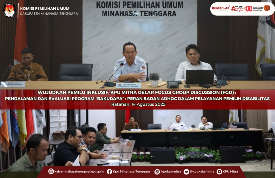 Ratahan - KPU Mitra terus memperkuat upaya pemenuhan hak politik seluruh warga negara secara inklusif dengan memastikan setiap pemilih mendapatkan informasi yang memadai serta fasilitas teknis yang menunjang partisipasi aktif di Tempat Pemungutan Suara (TPS). Komitmen ini tidak hanya diwujudkan melalui kebijakan internal, tetapi juga melalui forum kajian mendalam seperti pelaksanaan Focus Group Discussion (FGD) bertema “Bakudapa” yang digelar secara hybrid oleh Komisi Pemilihan Umum (KPU) Kabupaten Minahasa Tenggara pada Kamis (14/8). Inisiatif ini menjadi bagian dari kontribusi nyata terhadap tata kelola pemilu di Indonesia, terutama dalam menjamin aksesibilitas bagi pemilih disabilitas, sejalan dengan arah kebijakan inklusif KPU RI.